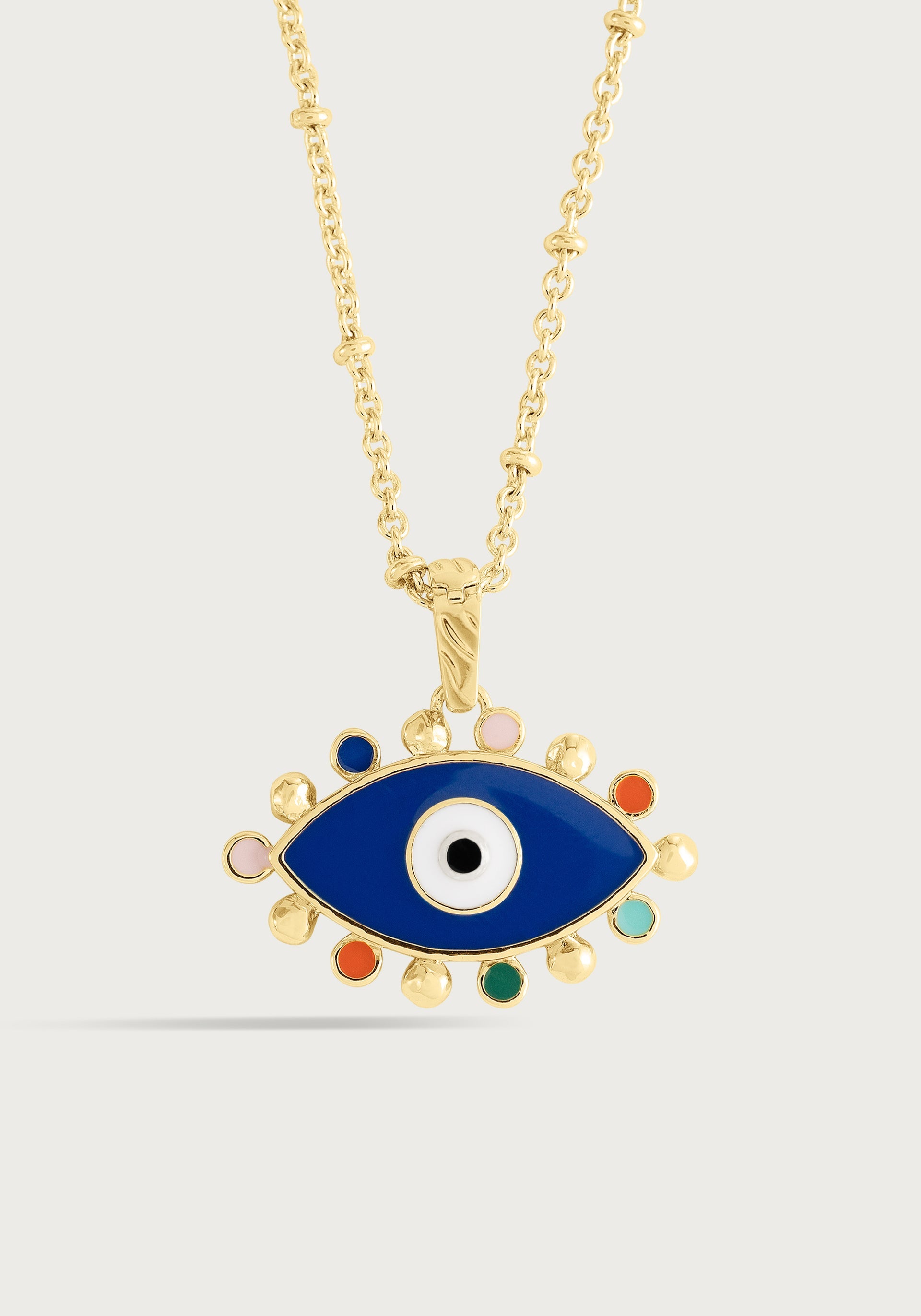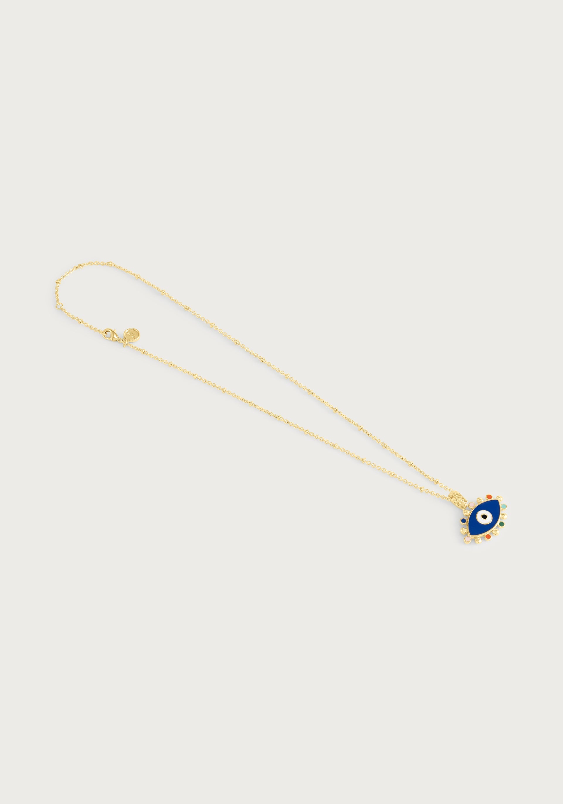 The evil eye charm honors the ancient Mediterranean tradition of protection and good fortune, featuring intricate hand-painted enamel that brings this timeless symbol to life with vibrant coastal colors. This meaningful talisman combines cultural heritage with contemporary craftsmanship, creating a beautiful guardian piece that adds both spiritual significance and artistic beauty to your personalized necklace.